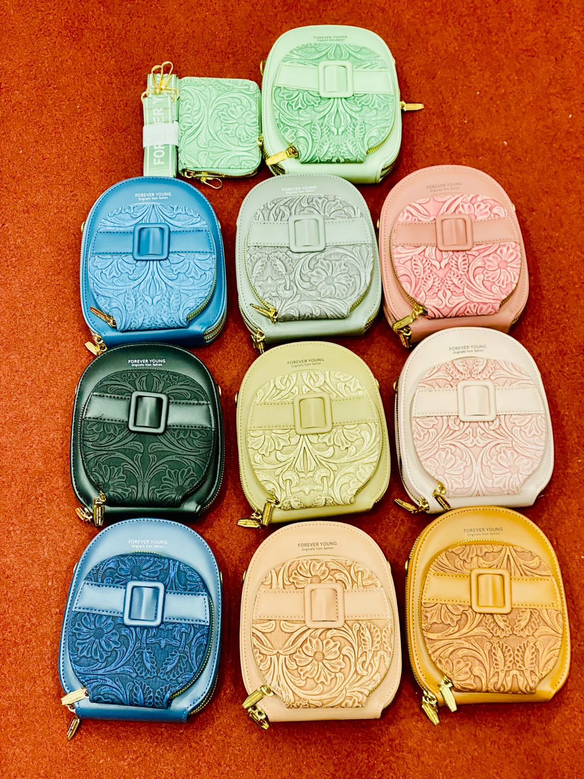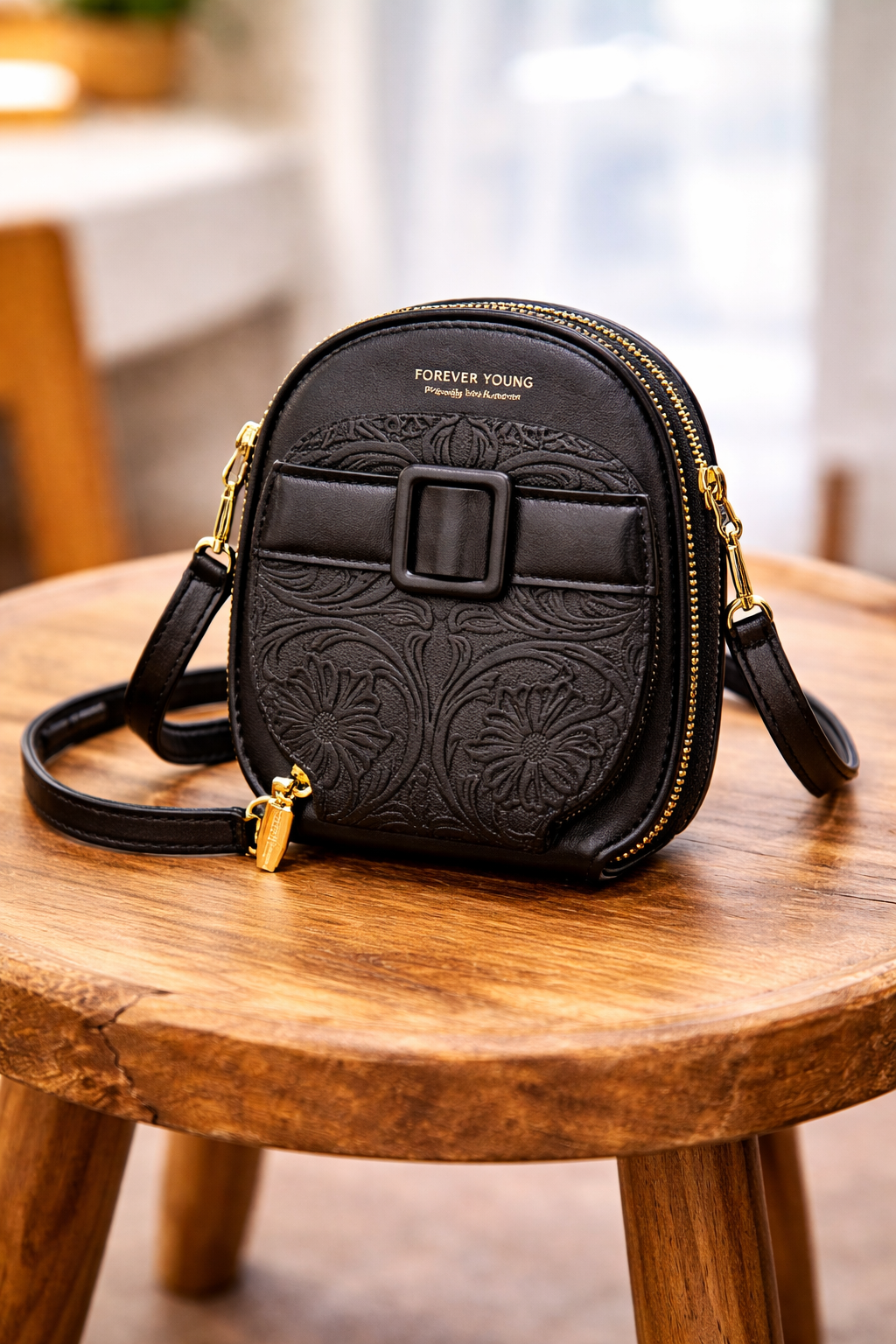 A stylish black mini crossbody bag featuring an elegant floral embossed design, gold zipper details, and a compact yet practical shape for daily use.