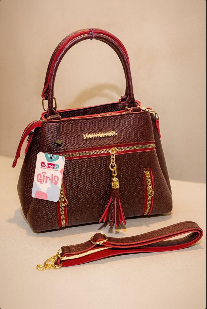 A stylish brown handbag with red accents, multiple zip pockets, and a decorative tassel. Comes with a detachable strap for versatile carrying.