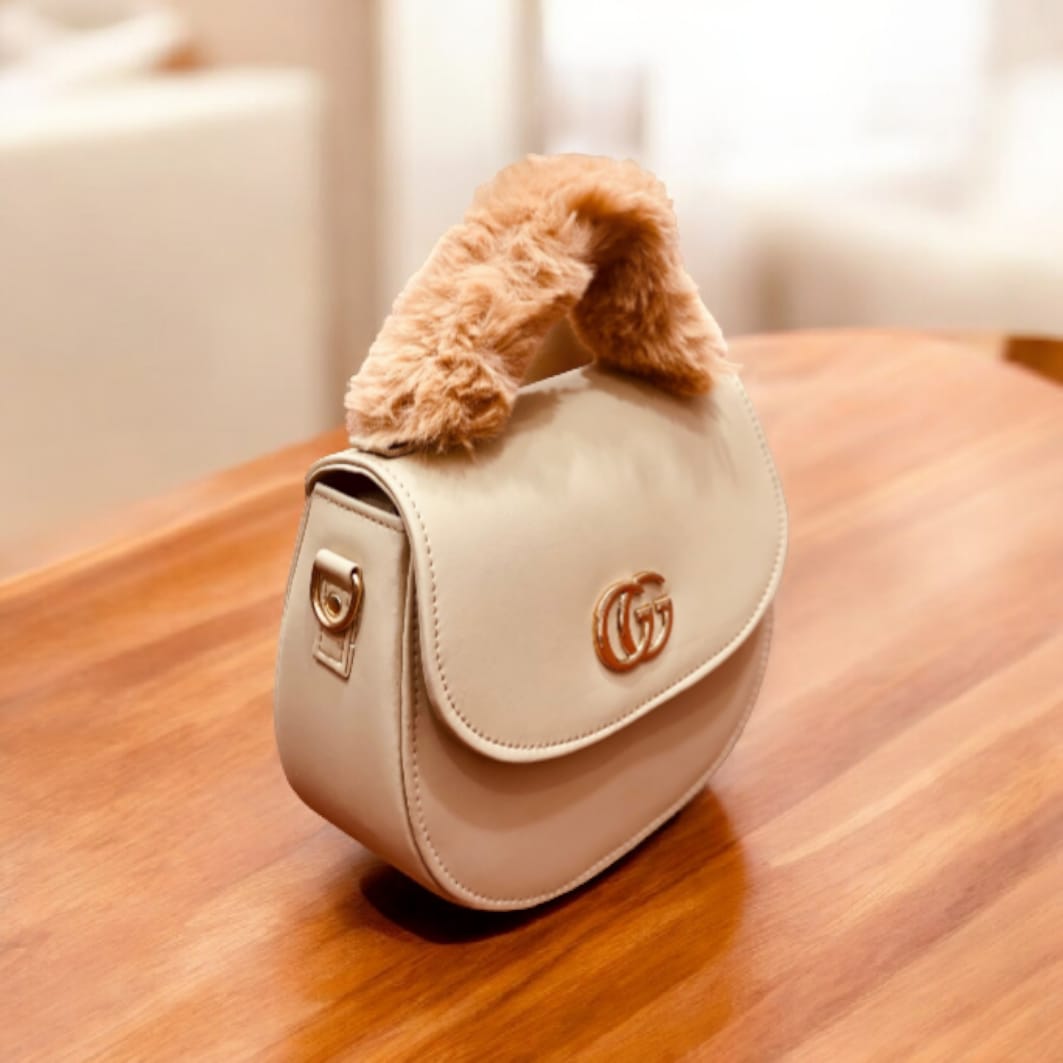 A chic beige handbag featuring a faux fur handle and the iconic GG logo. Perfect for adding sophistication and style to your everyday look.