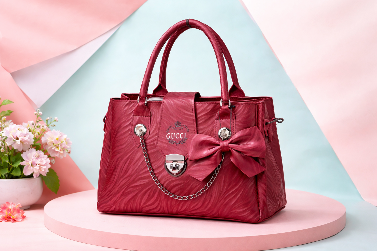 A stylish maroon handbag featuring a rich textured finish, decorative bow detail, and elegant chain accent. Perfect for adding charm and sophistication to any outfit.