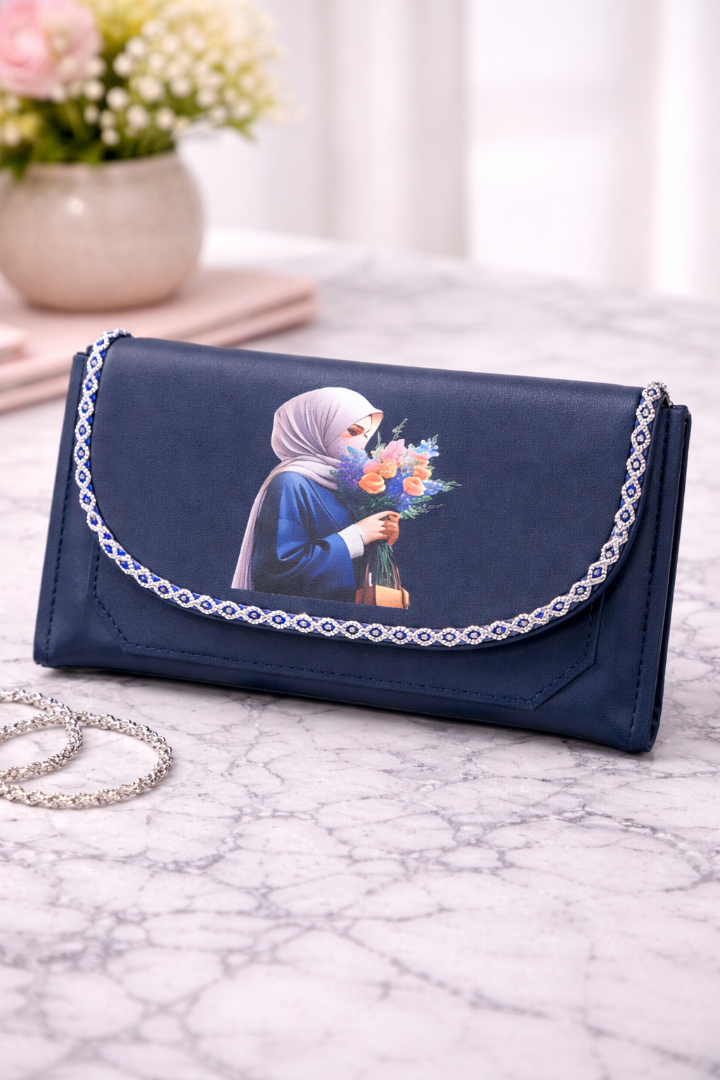 A stylish navy blue clutch featuring a graceful printed design and shiny silver detailing. Perfect for parties, weddings, and formal events.