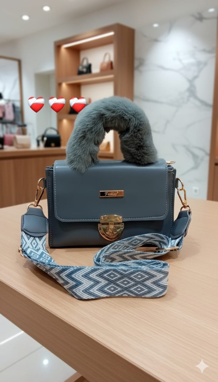 A stylish gray handbag with a plush fur handle and a fashionable geometric strap. Perfect for adding a touch of sophistication and comfort to your outfit.
