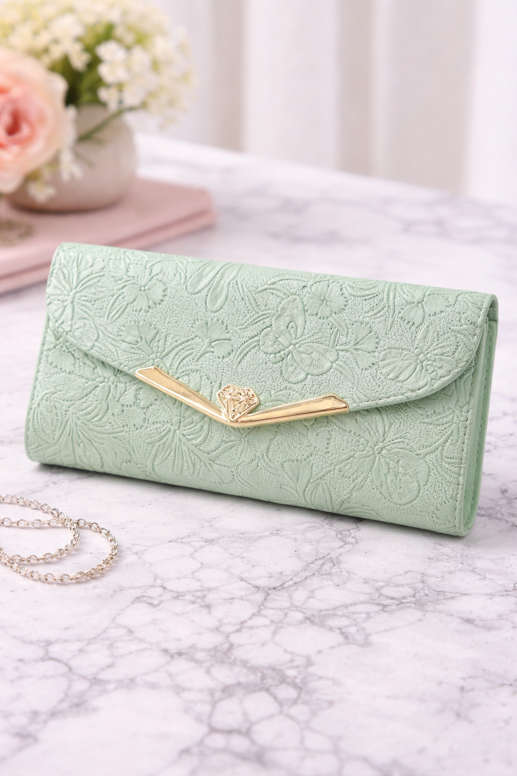 A stylish mint green clutch featuring an embossed floral design and elegant gold lock. Perfect for parties, weddings, and formal occasions.