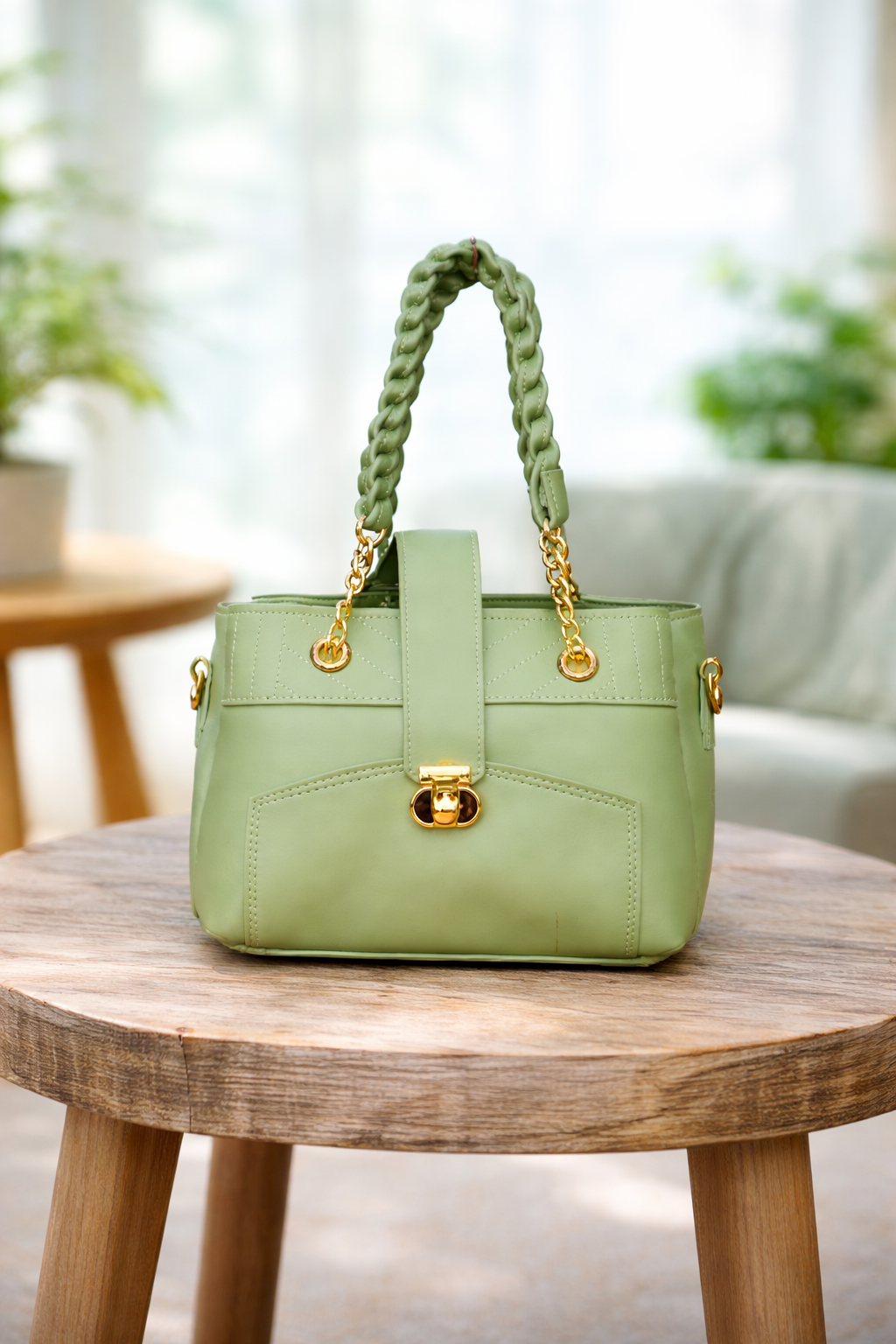 A stylish mint green handbag featuring a braided top handle, elegant gold chain accents, and a secure turn-lock closure. Perfect for everyday elegance.