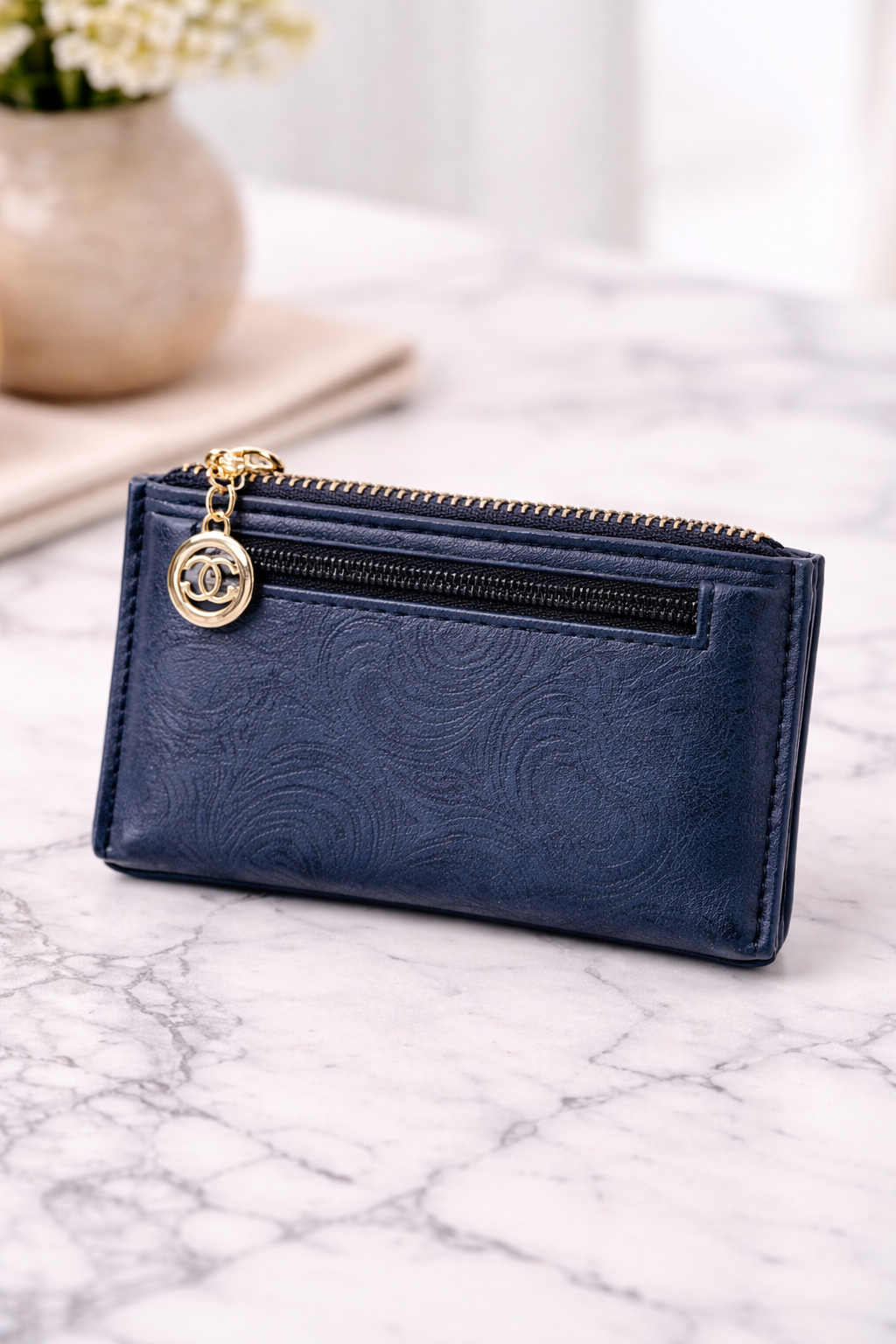 A sleek navy blue zip wallet with a gold charm detail. Compact, stylish, and perfect for everyday use.