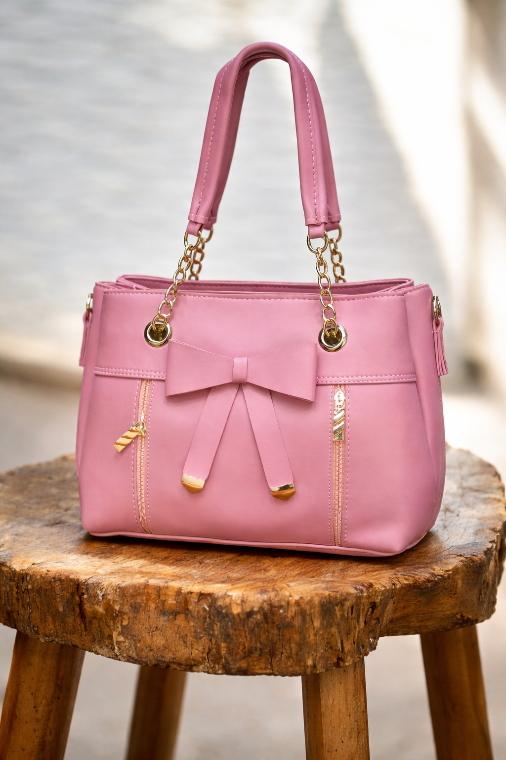 A stylish pink handbag featuring a cute bow design, gold chain handle details, and a smooth finish. Perfect for everyday and casual wear.