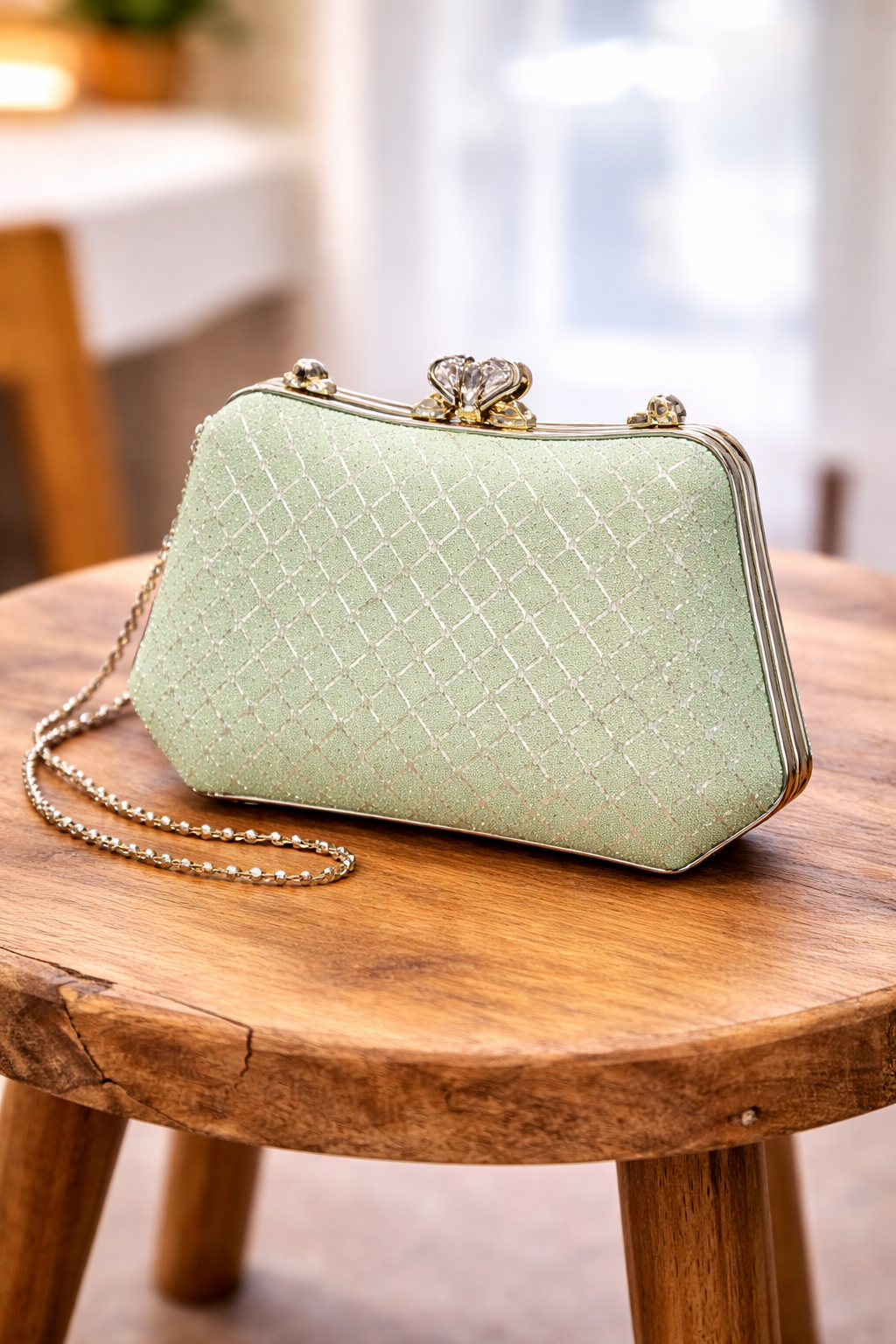 An elegant skin green party clutch featuring a shiny textured finish and crystal lock. Perfect for weddings and special occasions.
