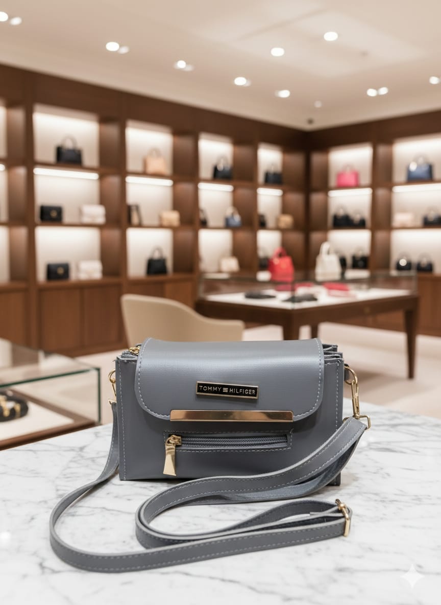 This Tommy Hilfiger crossbody bag offers a sleek design in a sophisticated gray color with a stylish gold-tone clasp, making it the perfect accessory for any fashion-forward woman.
